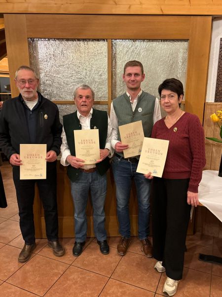 Nach der Preisverteilung verleiht Karl-Heinz Landkammer den langjährigen Mitgliedern eine Ehrung. Georg Dasch und Johann Pybetz wurde für 50 Jahre Mitgliedschaft des Schüzenverbands geehrt. Uschi Maier wurde für ihre 40-jährige Vereinszugehörigkeit geehrt. Florian Berger erhielt für seine 25-jährige Teilnahme am Sportschießen die Nadel.