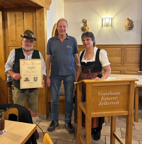 Schützenmeister Dieter Maier zum Ehrenschützenmeister zu ernennen. Die Wahl wurde durch Handzeichen der anwesenden Mitglieder durchgeführt. Es wurde einstimmig abgestimmt. Herr Dieter Maier nahm die Wahl an und es wurde ihm, durch Schützenmeisterin Regina Maier und Sportleiter Josef Panzer, ein Zertifikat überreicht.